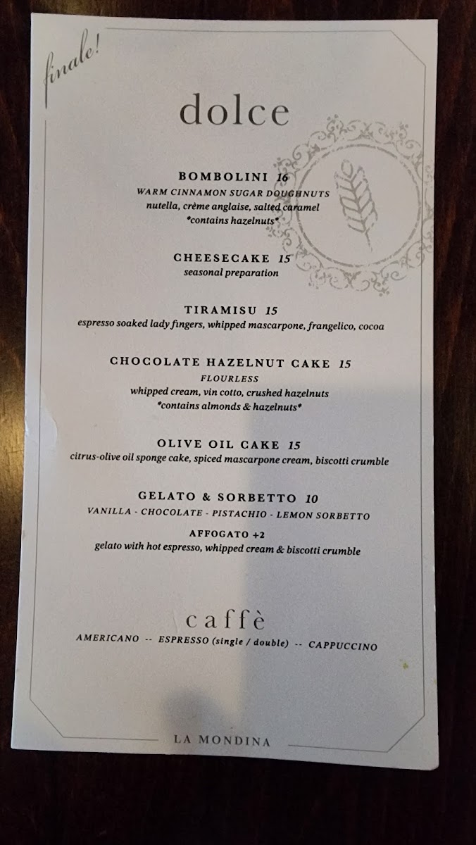 Had a fantastic time during our recent visit! Despite the bustling Saturday night crowd, the experience was flawless from start to finish. The food was exceptional. The drinks were a delightful complement to our meal, perfectly crafted and delicious. What truly stood out was the impeccable service. Despite the busy evening, the staff was incredibly attentive, making us feel like valued guests. Their knowledge of the menu and genuine warmth elevated our dining experience. La Mondina exceeded my expectations.